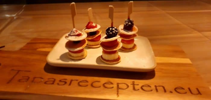 Spuit voorzichtig rondjes in de koekenpan. Doe niet teveel tegelijk in de pan zodat ze niet tegen elkaar aan komen. Het liefst maak je kleine rondjes, zodat het mooi aansluit met het fruit.