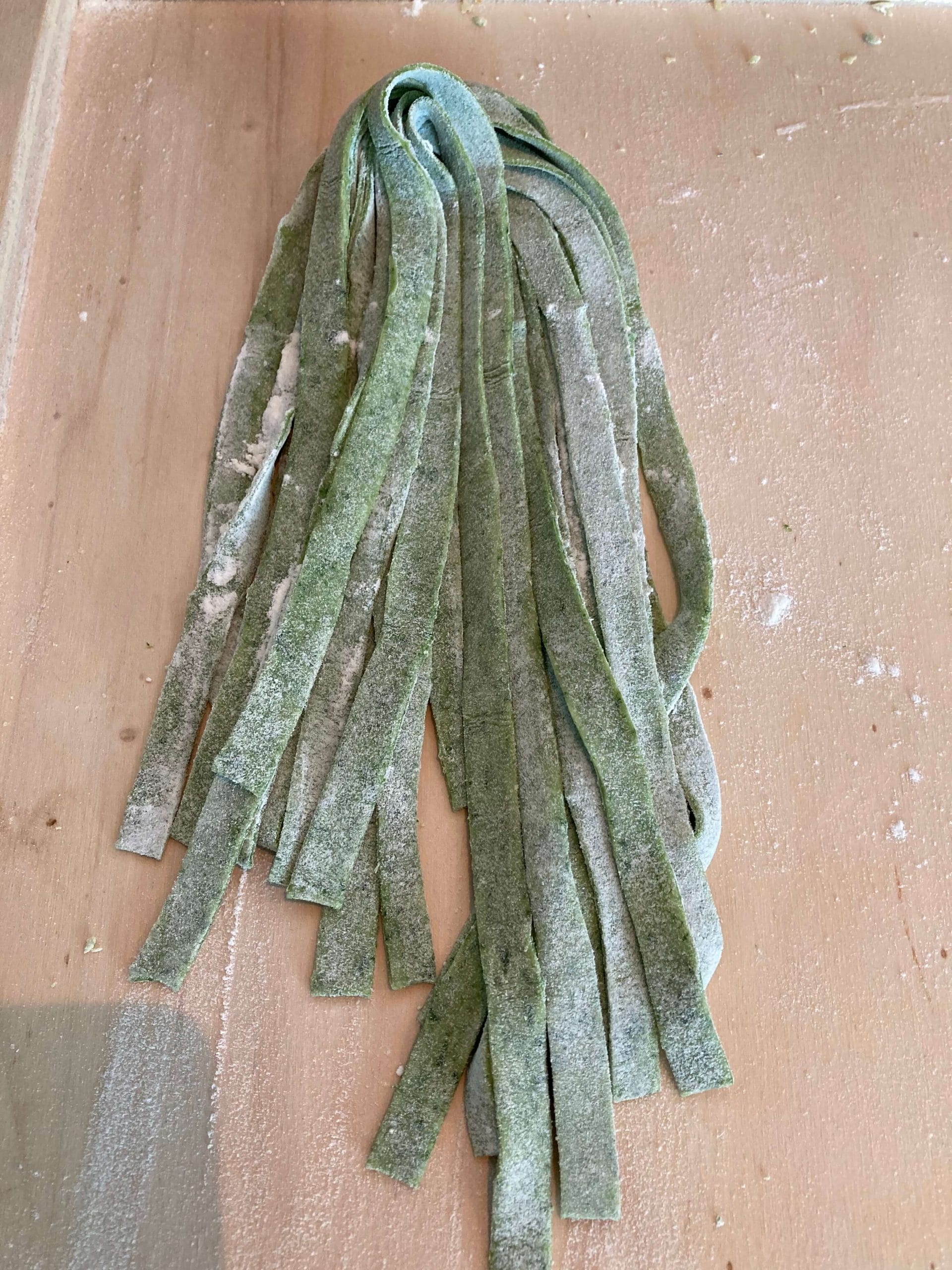 Leg de bol weg onder een schaaltje en laat de bol rusten voor minimaal 30 minuten. Herhaal vervolgens de stappen beschreven in het recept voor gewone tagliatelle, om de tagliatelle stroken te maken (zie link bovenaan de stappen van dit recept).